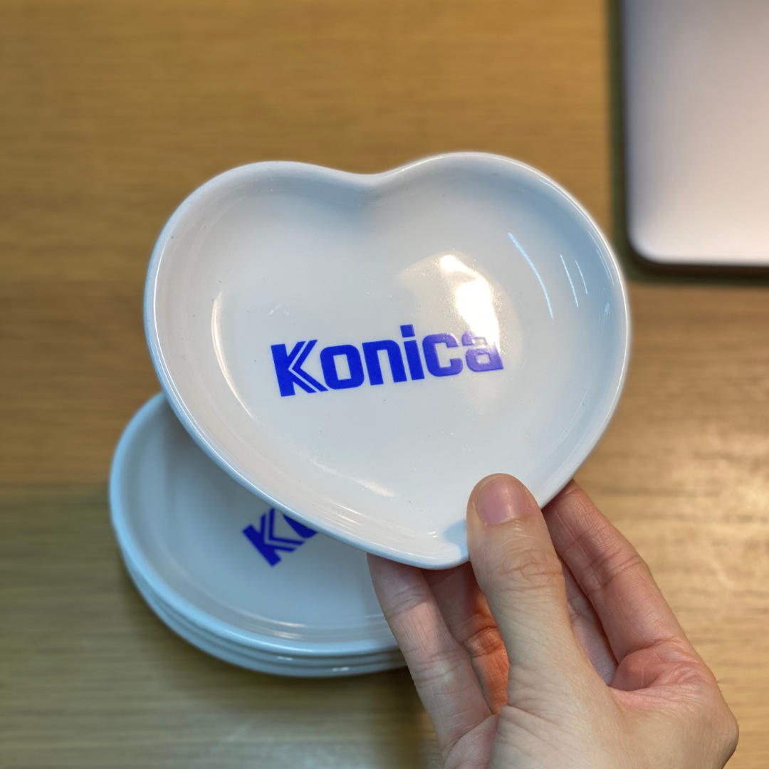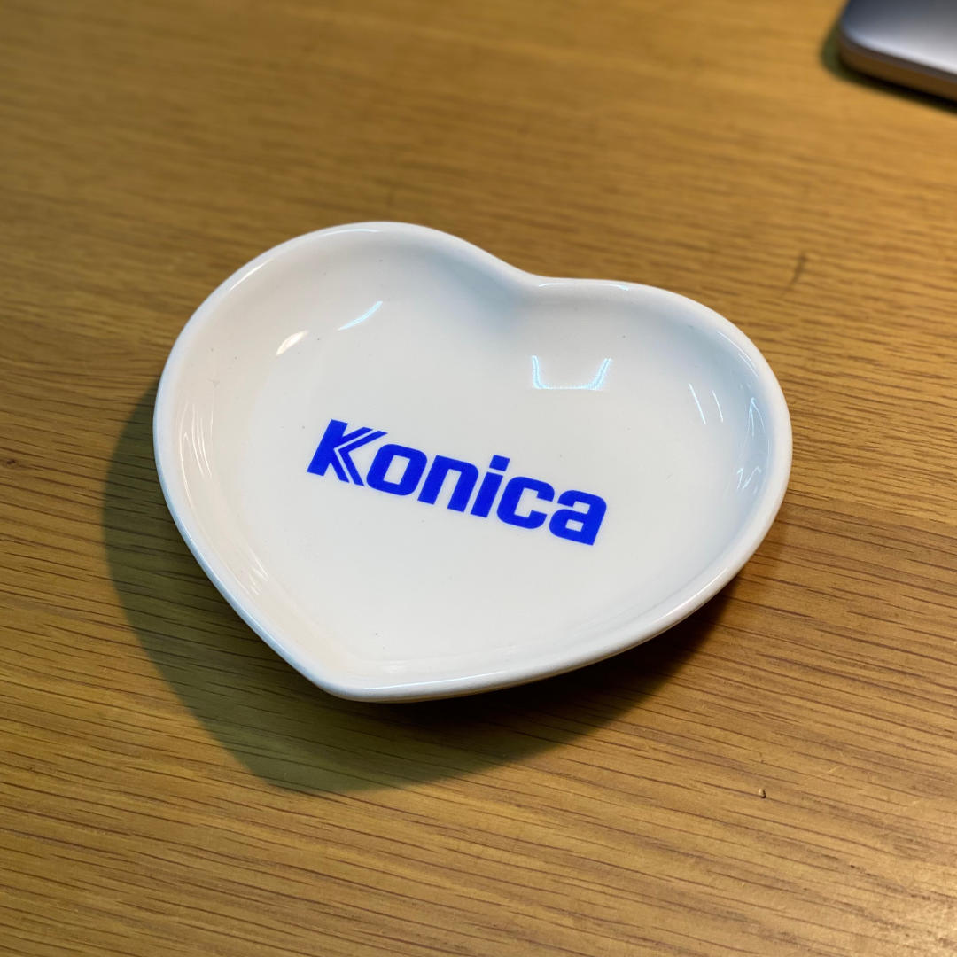 早期日本柯尼卡 Konica 的瓷製心型置物盤,上面印有藍色「Konica」字樣